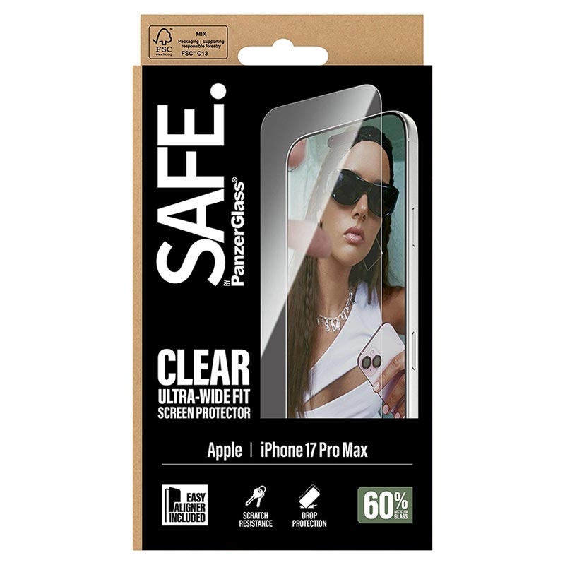 The SAFE. by PanzerGlass Screen Protector for iPhone 17 Pro Max offers superior protection with 60% recycled glass, safeguarding your device from drops, scratches, and shocks. Its ultra-wide fit ensures full coverage and clear screen visibility, while the fingerprint-resistant coating keeps your screen clean. With 100% touch sensitivity and easy installation using the included EasyAligner, this screen protector blends sustainability and functionality seamlessly.