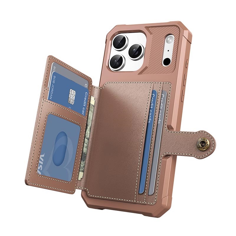 - iPhone 17 Pro Max wallet case has a secure snap button closure, wallet design, and several card slots with a cash pocket