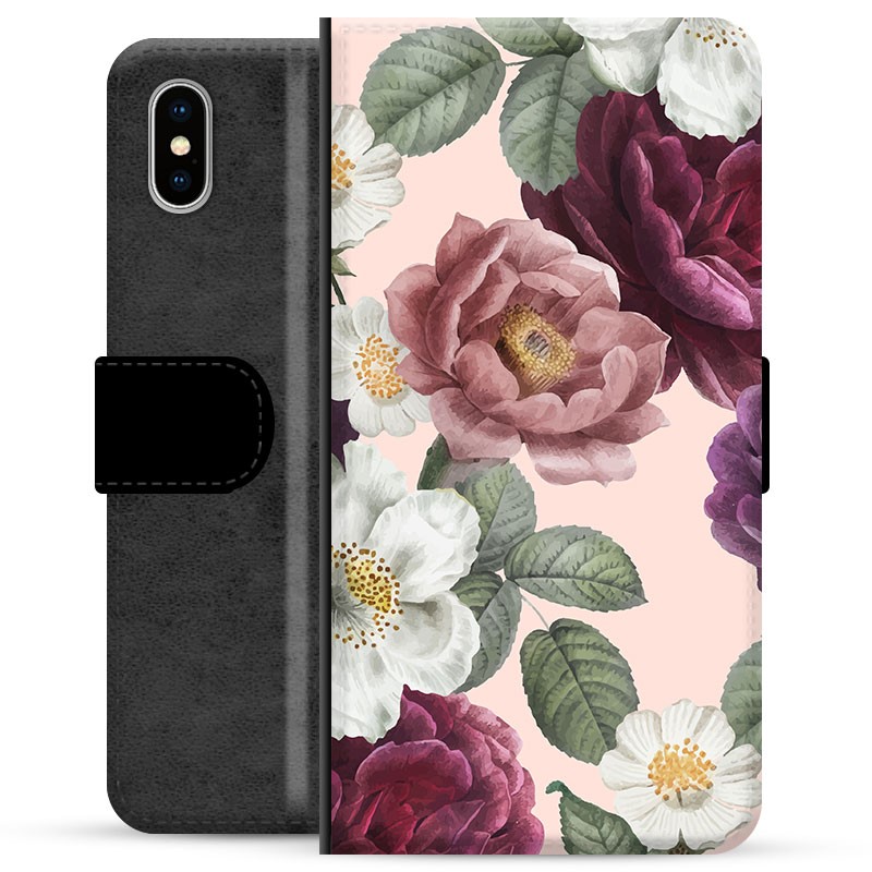 This iPhone X / iPhone XS Premium Wallet Case is adorned with a romantic flowers print, featuring plush roses in rich hues of burgundy and pink, interspersed with delicate white flowers and set against a soft pink background. The design brings together an elegant blend of colors and botanicals, making it a perfect accessory for those with an appreciation for floral aesthetics.