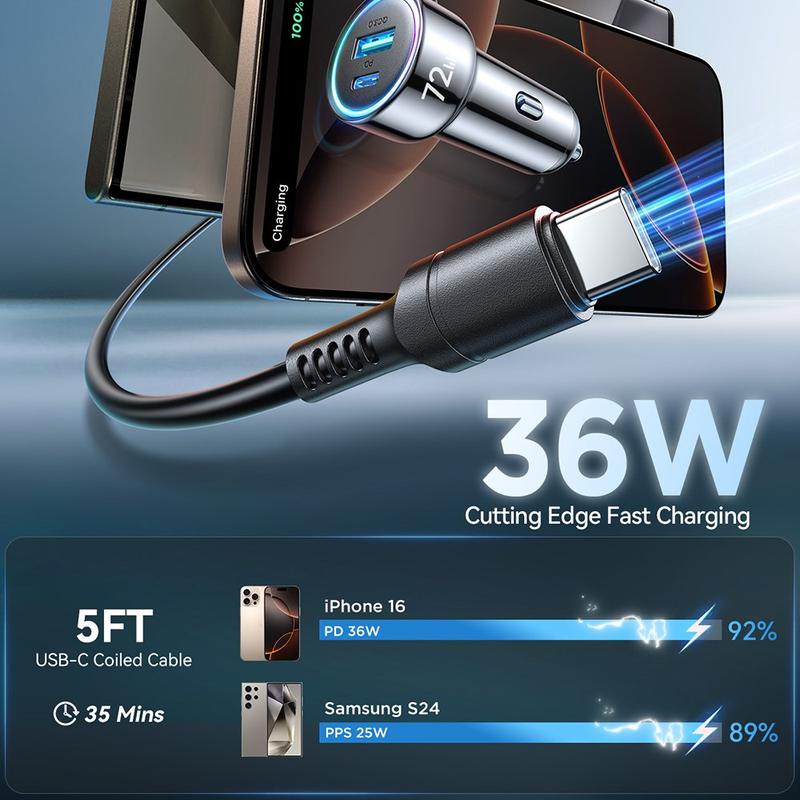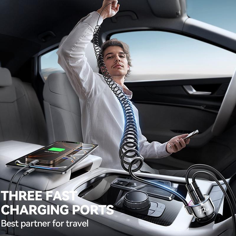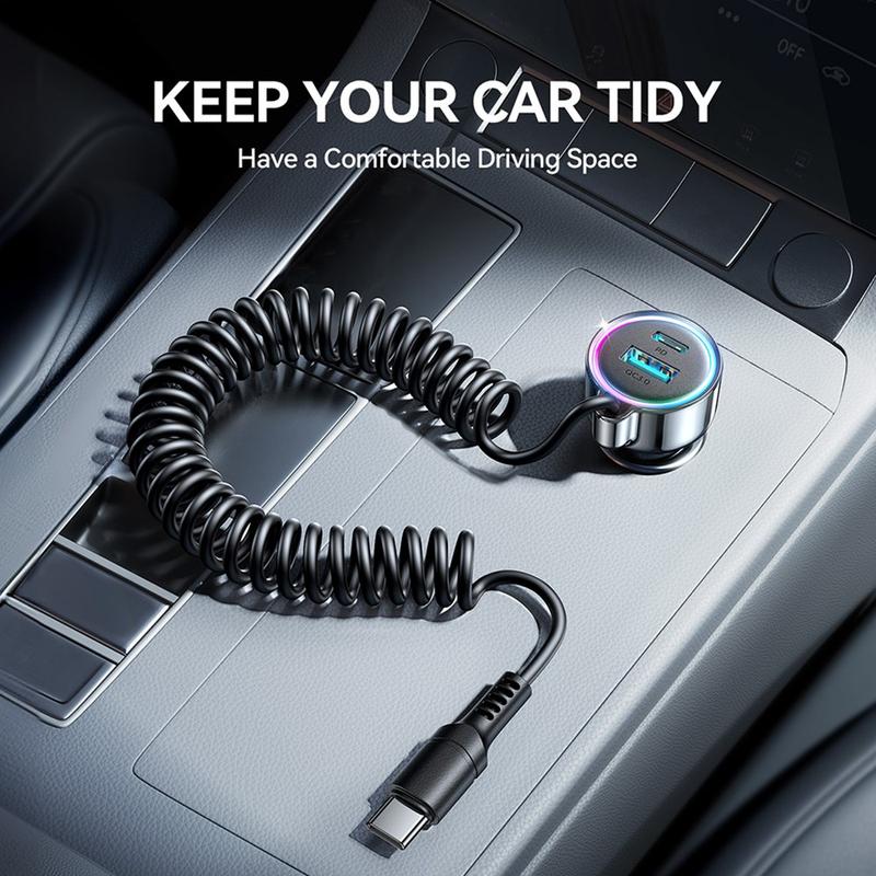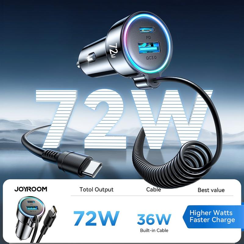 Joyroom CL07 72W 3-in-1 Fast Car Charger with 1.6m Type-C Spring Cable and USB-C/USB-A Ports