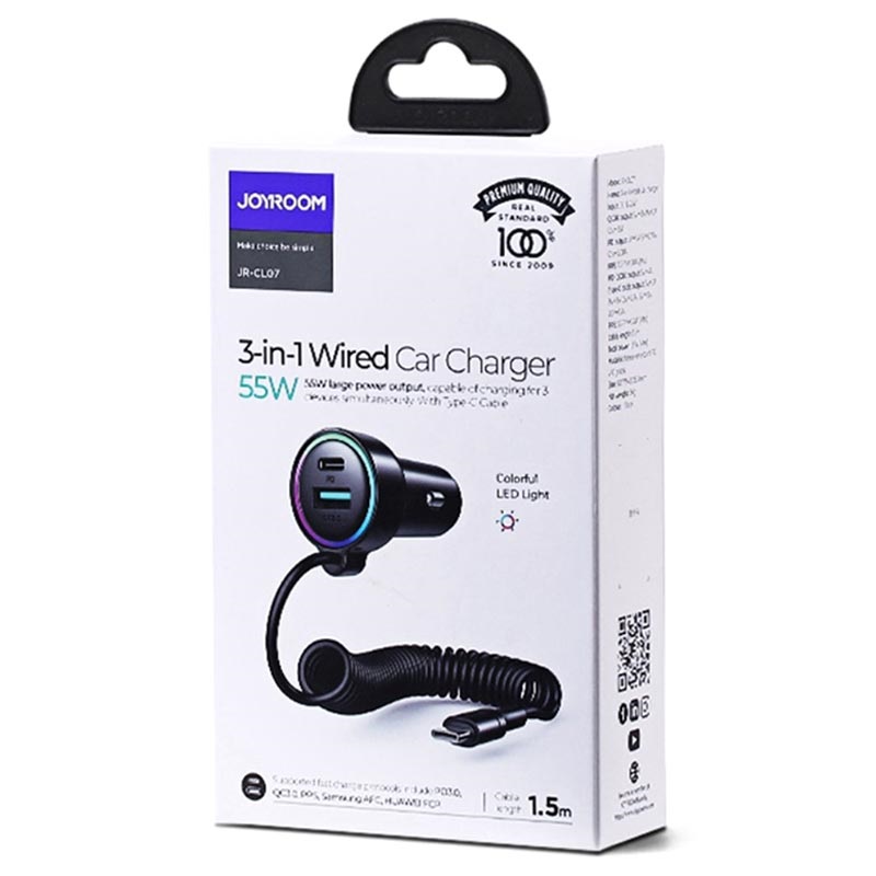 Joyroom JR-CL07 3-in-1 Wired Fast Car Charger 55W - 1xUSB, 1xUSB-C, QC3.0, PD, PPS, AFC, FCP
