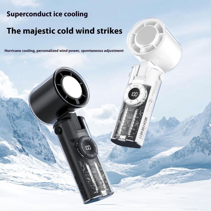 • K-811 Transparent Mecha Handheld Fan - 100-Speed Foldable Portable Cooler with Semiconductor Ice-Compress & LED Flashlight, Rechargeable