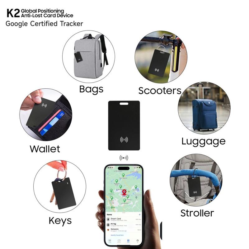 Keep keys, wallets, bags, or pet collars easy to find with the K2 card-style tracker. Designed to work with the Google Find My Device app on Android 9 or higher, it shows the last known location on Google Maps and helps you ring or locate items fast. A one-button design makes power on or off simple, audible beeps confirm actions, and once paired the tracker locks to your account for extra security. Compact, lightweight, and privacy-focused, it is a tidy way to protect what matters.