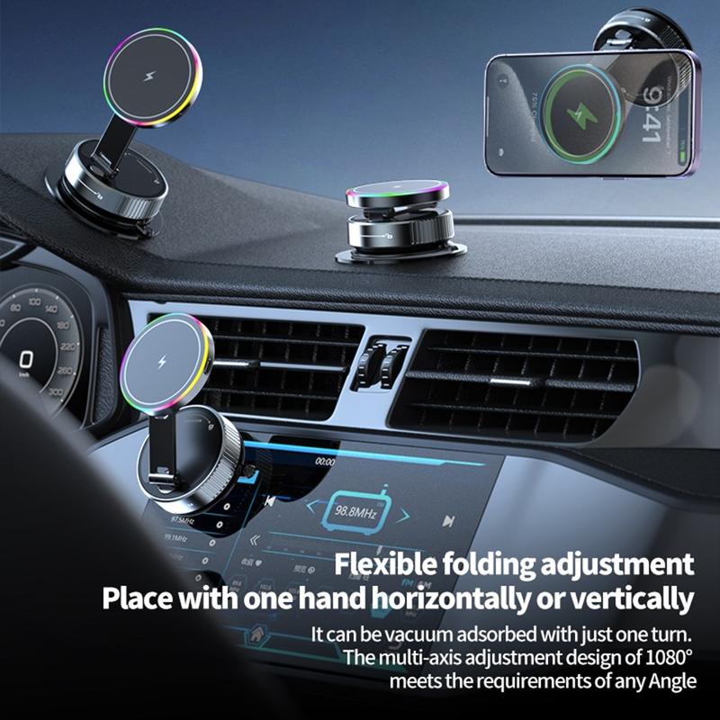 K3 Rotating Magnetic Car Holder - 15W Wireless Charging, N52 Magnets, LED Lights, 360° Adjustable, Vacuum Sucker Base for Car & Desktop