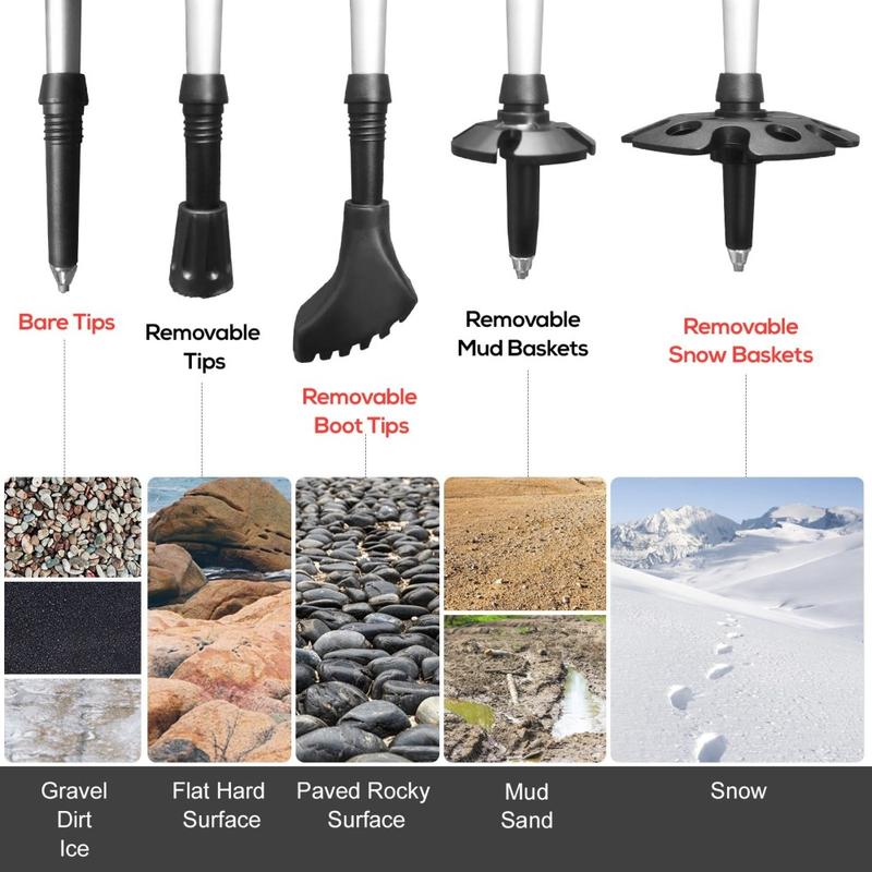 Heavy duty 4 season accessories, includes 2 removable tips, 2 removable snow baskets, 2 removable mud baskets and 2 boot tips, to fit different conditions
