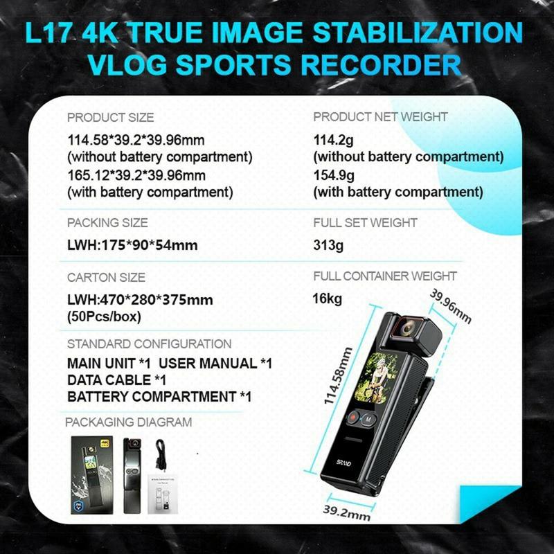 Capture smooth, wide-angle action in crisp detail with the L17 action camera. Designed for sports, travel, and everyday adventures, it records 4K video at 30fps and supports multiple high-frame-rate modes up to 720p at 120fps for slow-motion clips. A 180-degree rotatable lens with a 160-degree wide view makes it easy to switch perspectives quickly, from helmet-style angles to handheld vlogging and creative shots.