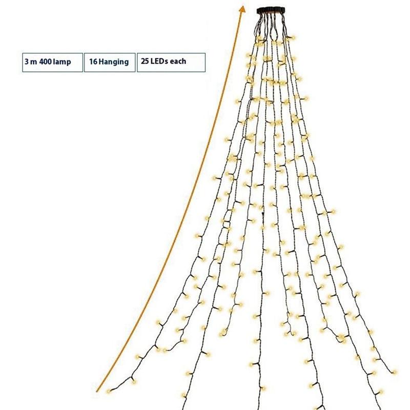 Transform your Christmas tree into a dazzling centerpiece with the 3m 400-Light LED Waterfall Christmas Tree Lights. Featuring 8 festive lighting modes and 400 warm white LEDs, this decoration creates a magical holiday atmosphere. Designed for ease of use, installation takes less than a minute—simply place the ring on top of your tree and let the 10 light strands cascade down. Perfect for indoor and outdoor setups, these IP44 waterproof lights are safe, durable, and bring warmth to your holiday celebrations.