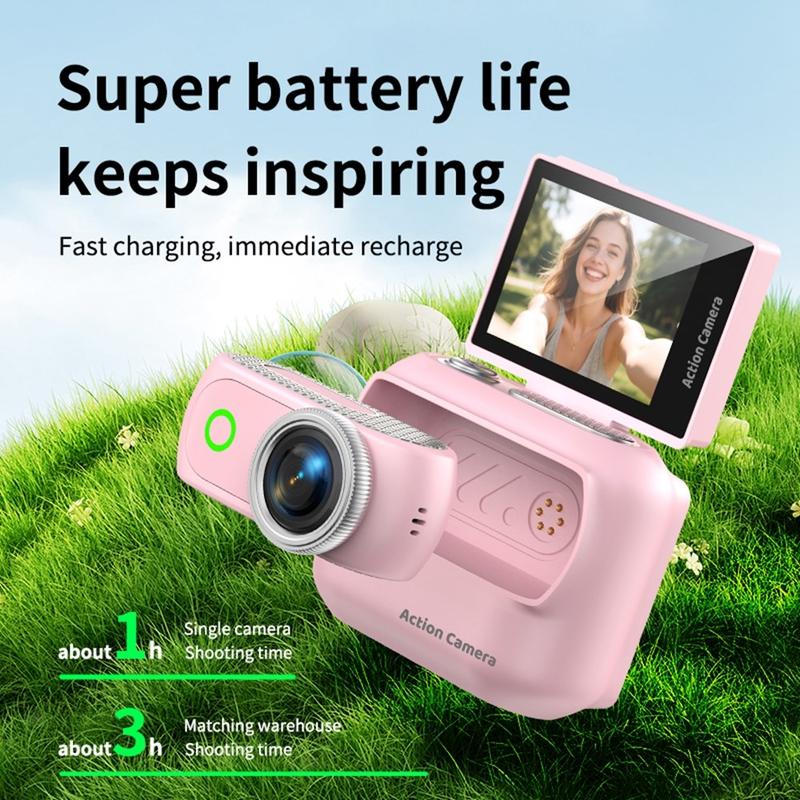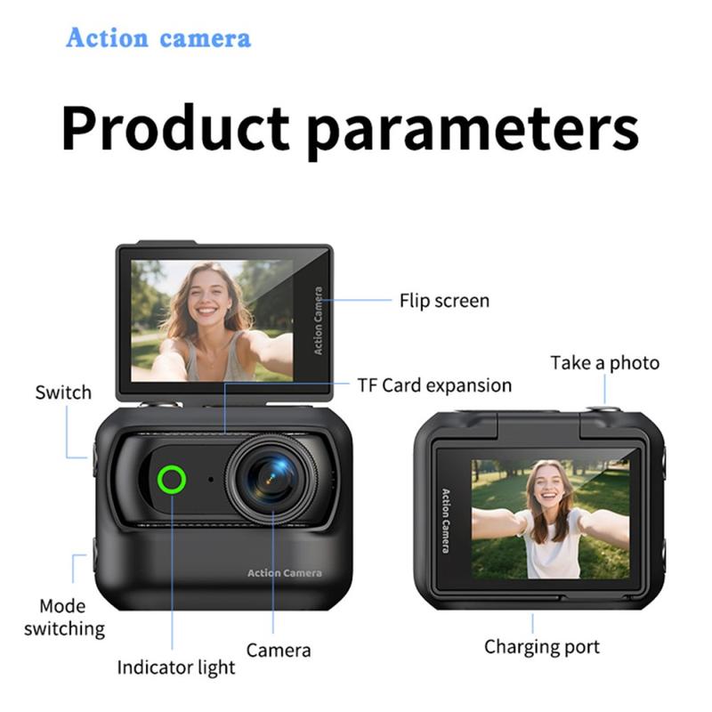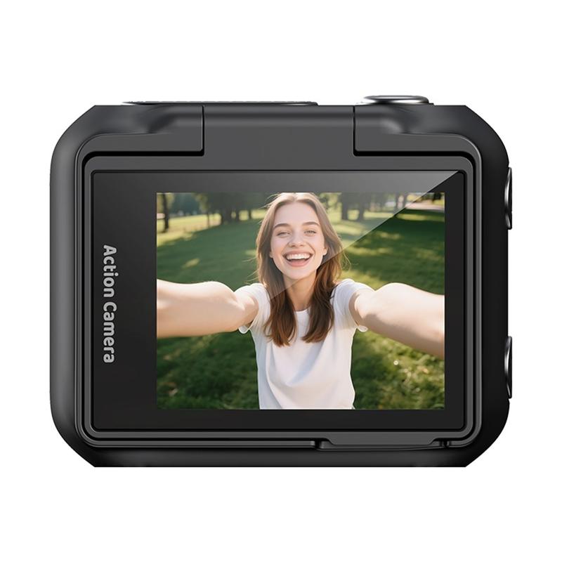 - Compact action camera designed for vlogging, sports recording, and hands-free everyday filming