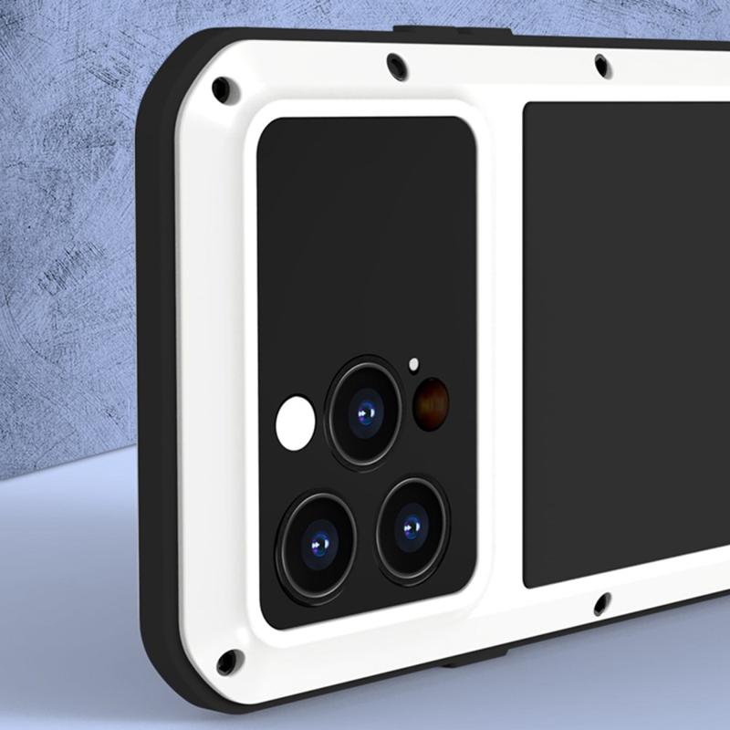 LOVE MEI For iPhone 14 Pro Silicone + Metal Shockproof Case Splash-proof Phone Cover with Tempered Glass Screen Protector