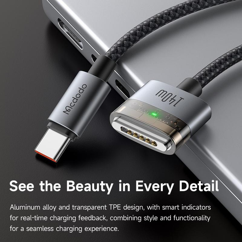 Charge your devices faster and smarter with the MCDODO CA-207. With 140W power delivery support, this cable is designed to provide a steady, efficient charge to your Apple devices, including MacBooks and iPhones, with the added convenience of magnetic alignment for an instant connection.