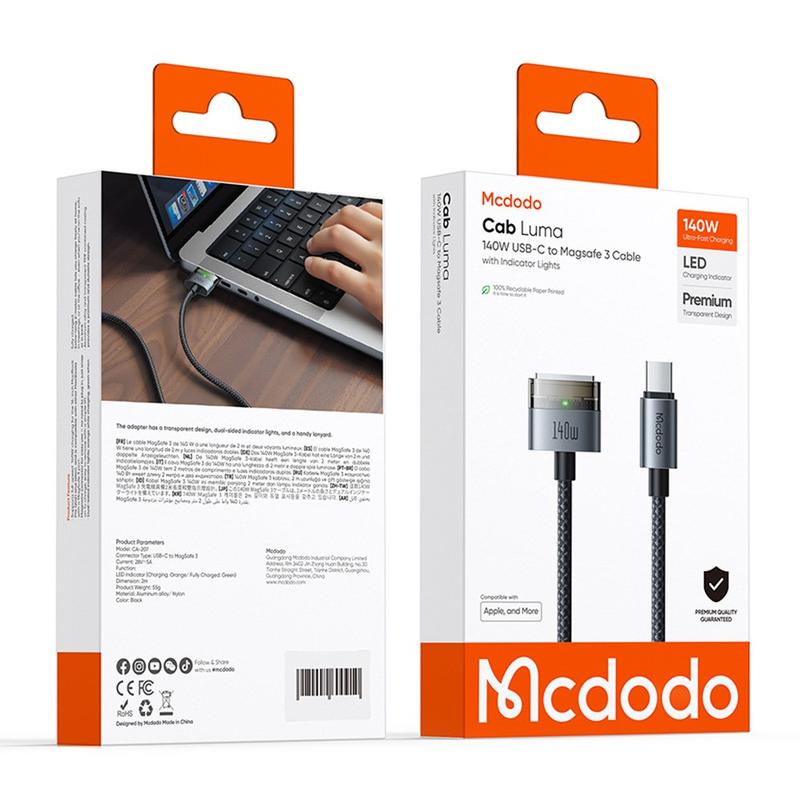 Mcdodo CA-207 140W USB-C to MagSafe 3 Charging Cable - 2m - Nylon Braided with Indicator Light