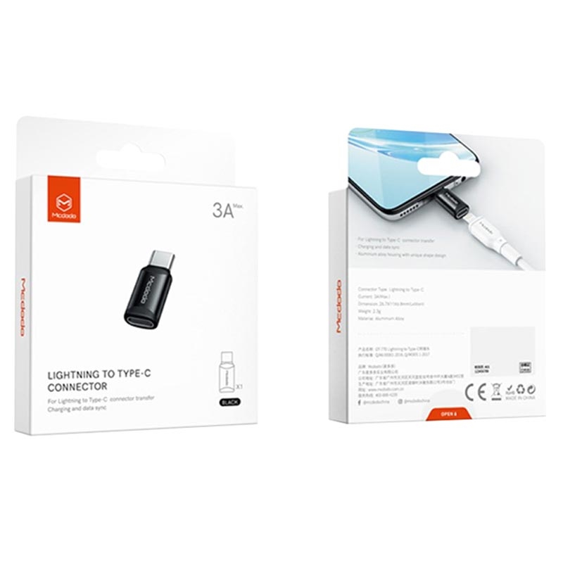Mcdodo OT-7700 is the adapter that allows you to connect the Lightning cable to USB-C devices. It supports 3A Fast Charge, so you can recharge the device quickly and transfer data as well. Also, it has a built-in identification resistor, intelligently matches safe current, and protects your device.