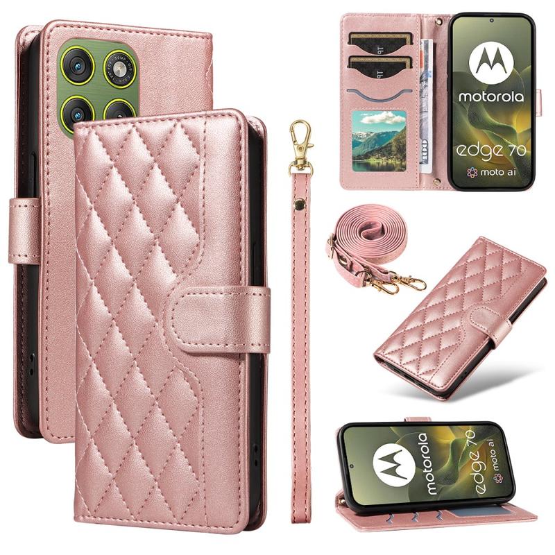 Luxury Quilted Wallet Case with Shoulder & Wrist Strap for Motorola Edge 70 - Rhombus Pattern Protective Cover