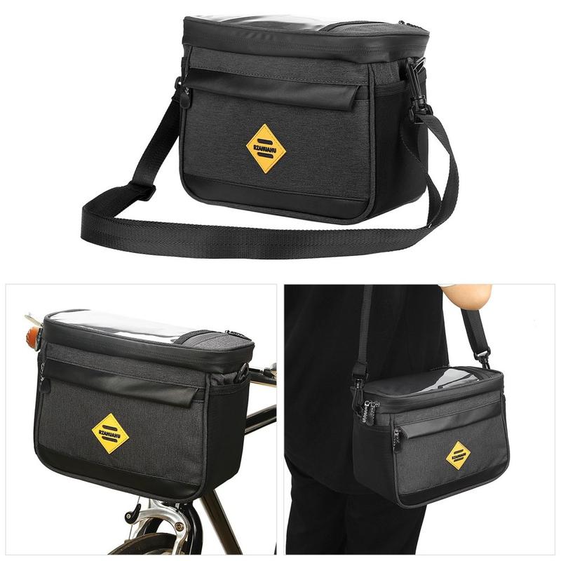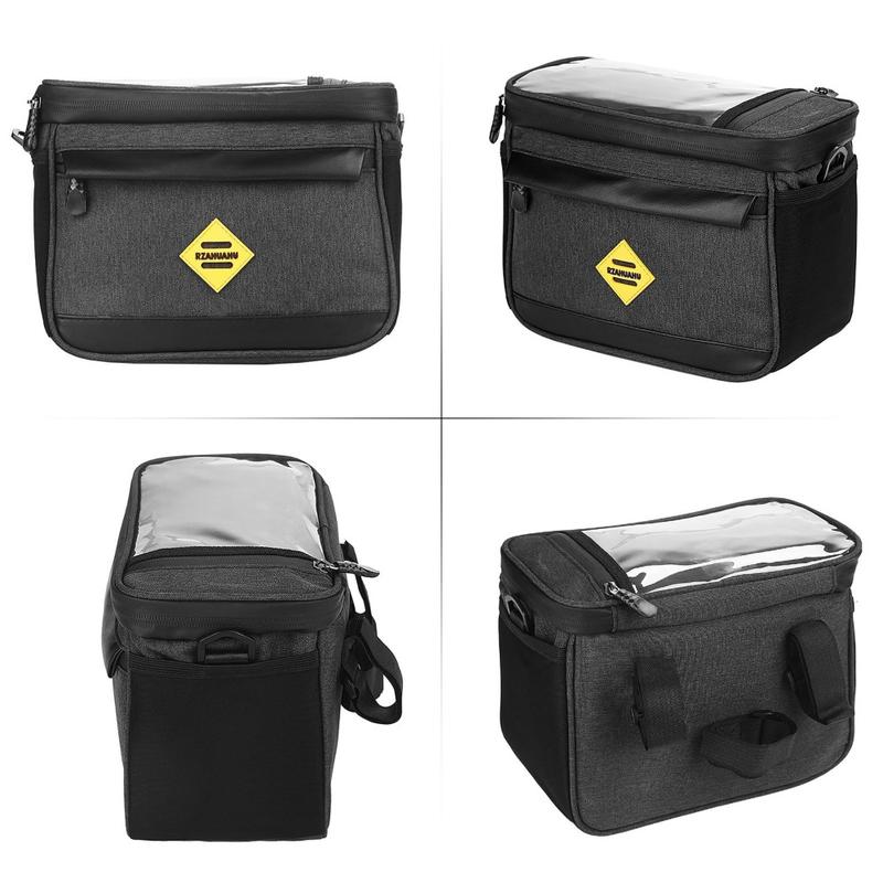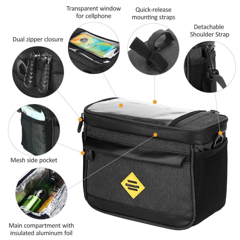 This handlebar bag is constructed of water-resistant oxford cloth for long-term use. The zippered main compartment is spacious and insulated, which means it can hold a lot of items while also keeping your beverage cool. The transparent pouch on the top provides a convenient "display platform" for your map or cellphone. The mesh pockets on both sides can hold some small items within your reach in seconds. The zippered front pocket for safe storage of valuables. With an adhesive fastener strap, you can mount the bag on your bike handlebar easily. And the removable adjustable shoulder strap makes it convenient to carry when the bag is removed from the bike.