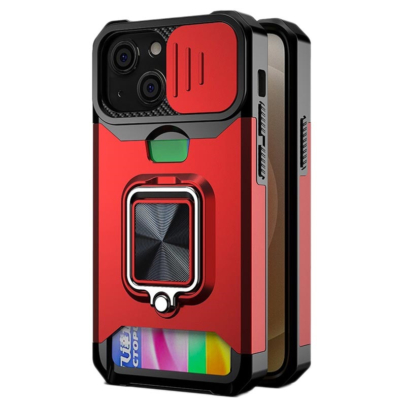 • Multifunctional 4-in-1 Hybrid Case for iPhone 13 Mini with Card Holder, Magnetic Ring, Kickstand, Camera Protection