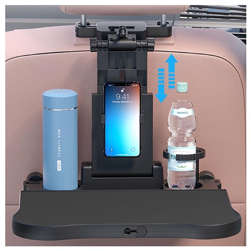 Thanks to the expendable back seat and table arm, a multifunctional foldable car seat tray table A08 can be used by children or adults. Equipped with several compartments, it has a place for two cups (one with an extendable security arm), a smartphone holder (6-10cm in width), a tablet holder (up to 29cm in length), and a tray table with anti-slip surface, which is convenient as a laptop stand. Mounted on the headrest and stabilized on the back of the seat, it remains in place even on bumpy roads.