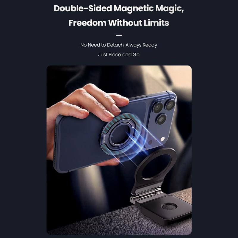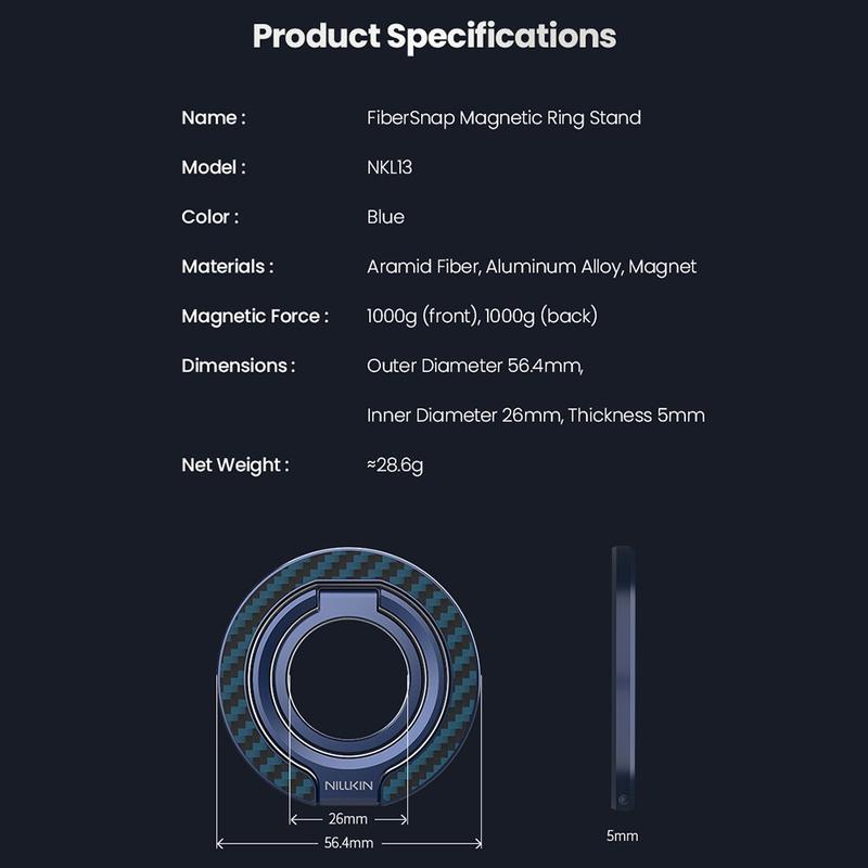 The Nillkin FiberSnap Magnetic Ring Stand blends premium materials with flexible functionality to elevate everyday phone use. Crafted from lightweight aramid fiber and anodized aluminium, it delivers a refined tech aesthetic while offering a secure grip and effortless hands-free viewing. Designed for seamless MagSafe use, it adapts smoothly to work, travel, and daily life without getting in the way.