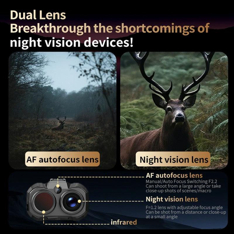 - Dual Lens Technology: Combines a long-focus night vision lens with an AF wide-angle lens for both close-range and long-distance shooting.