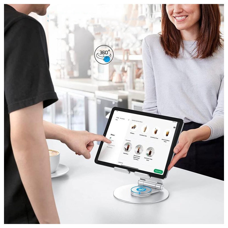 • You can choose to place the tablet horizontally or vertically Shared perspectives 360° rotary structure provides flexible viewing angles This stand boasts both a secure sturdiness when set up, as well as an ability to be collapsed, folded up, and slipped into a bag when finished Equipped with protective silicone pads, this stand holds your device to the right position whilst protecting your device safe from scratches and sliding off The stand can be folded up and can be used on business trips every day. It is very small and light does not take up space Specifications: Support: for 7-12.9 inches of cell phone/tablet Adjustment gear: 360 degrees adjustment  Product material: aluminum alloy + silicone Product process: CNC + anodic oxidation + surface sandblasting Product thickness: panel is 2.5mm/ base plate is 3mm Product size: 14.5 x 14.5 x 5cm