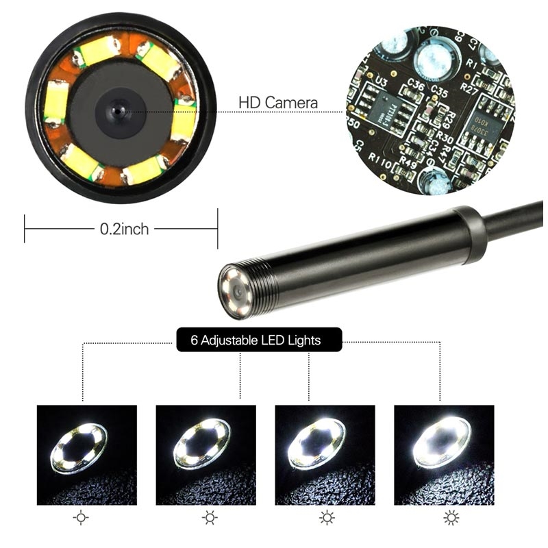 This borescope camera features a microUSB connector and USB adapter, allowing you to connect it to your microUSB smartphone/tablet or PC/laptop. With its IP67 waterproof certification, you can even use it in wet or underwater environments. The waterproof endoscope camera is equipped with six LEDs that enhance brightness for clear visibility.