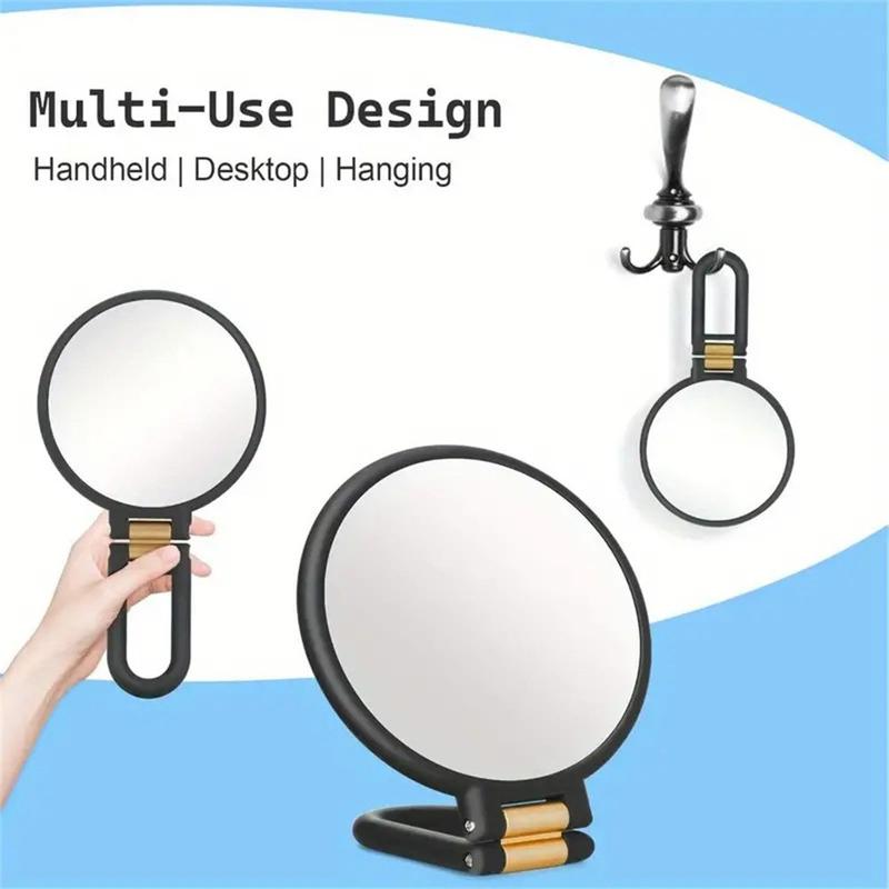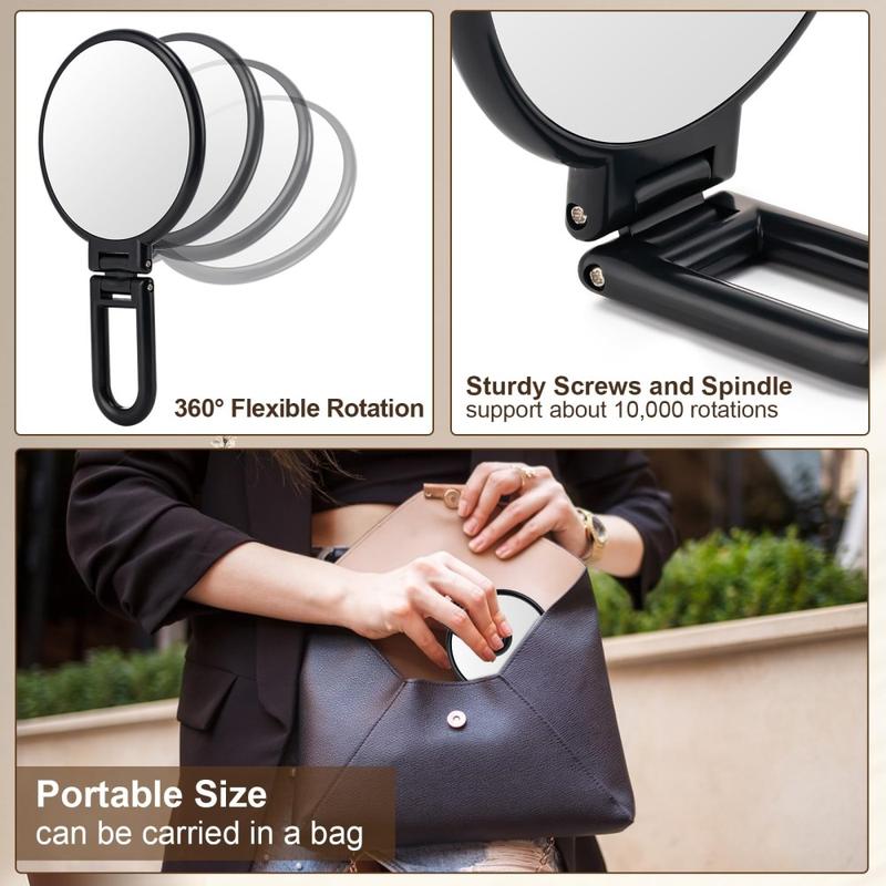 See every detail when it matters. This compact, folding mirror pairs a standard true-view side with a 10x magnifying side for precision tasks. The 360-degree rotatable handle locks into place so you can use it handheld, hang it from a hook, or stand it on a table. Lightweight and travel friendly, it slips easily into a bag for skincare, makeup touch-ups, or quick oral inspection on the go.