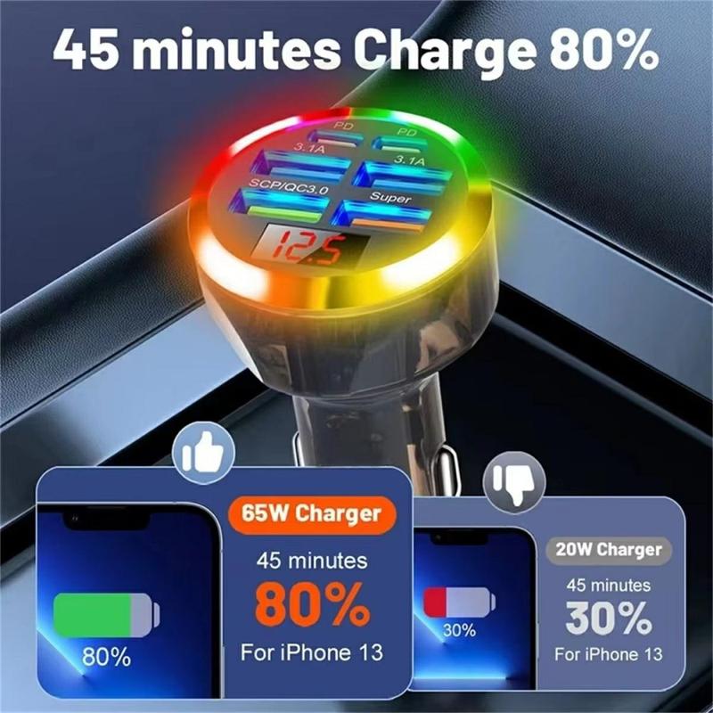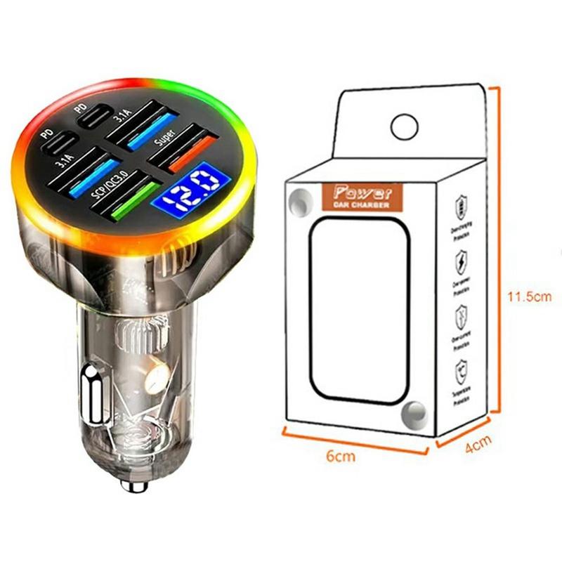 Portable 6-Port Car Charger 150W - Fast Charging Adapter with PD & QC3.0, Voltage Display, LED Light, Multi-Device Support - 2x USB-C Ports, 4x USB-A Ports