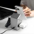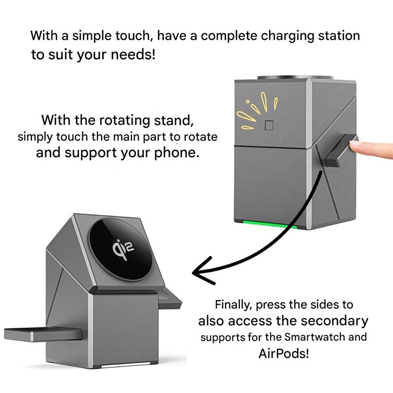 - Rotatable modular design converts from a compact cube into an open charging station