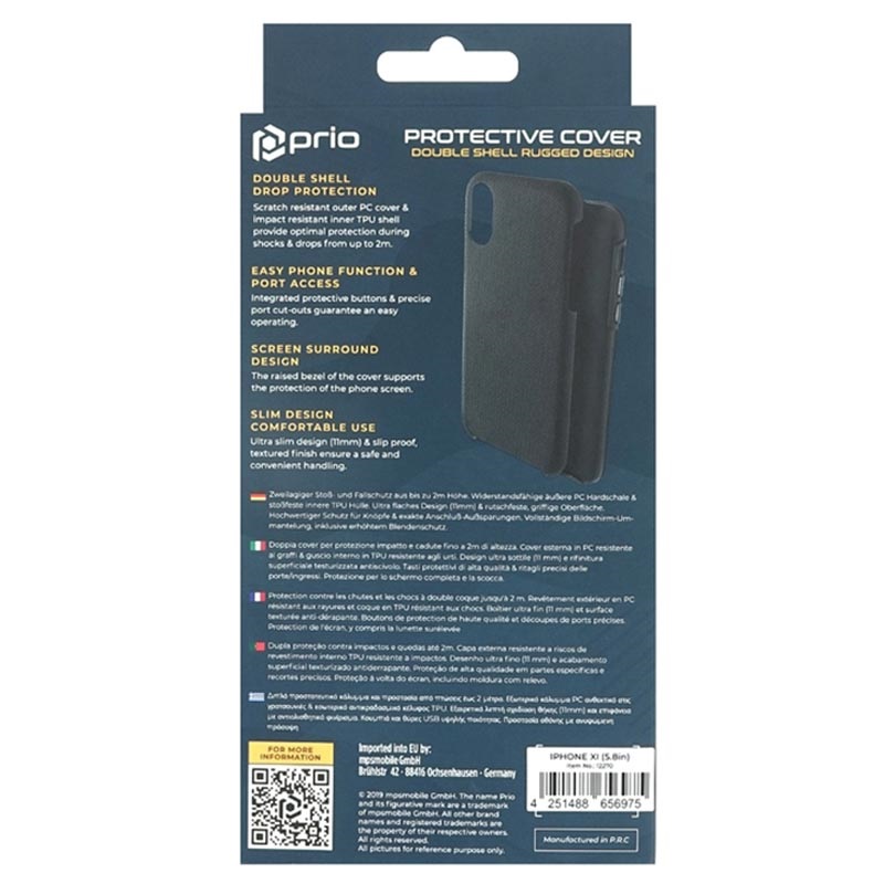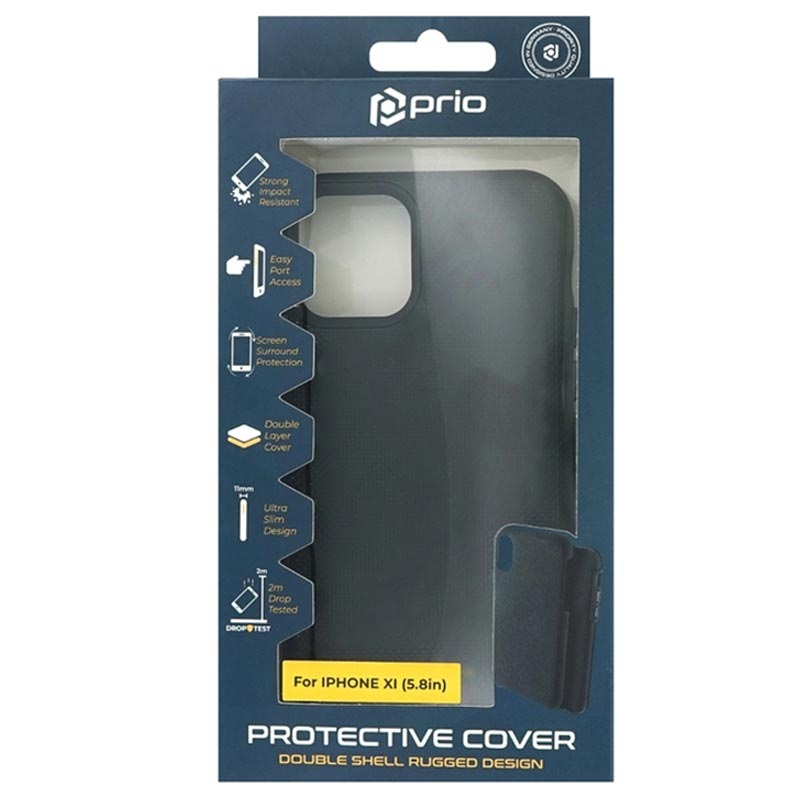 The Prio Double Shell hybrid cover for iPhone 11 Pro is drop-tested from up to 2m, and it passed. This Prio Double Shell hybrid case provides reliable protection for your iPhone 11 Pro against daily damage. It is made of selected materials: impact-resistant TPU and scratch-resistant PC. Although it has a dual-layer design, it's only 11mm thin when you insert your iPhone 11 Pro.
