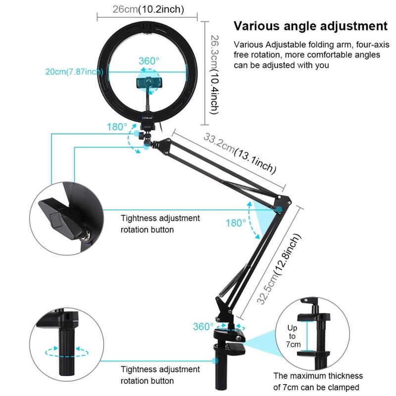 PULUZ 10.2" 26cm Ring Curved Light + Desktop Arm Stand USB 3 Modes Dimmable Dual Color Temperature LED Vlogging Selfie Photography Video Lights with Phone Clamp