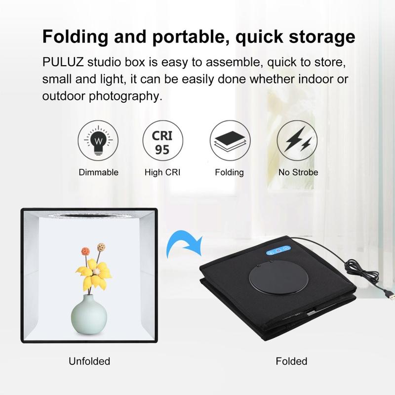 Portable folding design, easier to install and carry, built-in LED light, provide average light, prevent shadow and reflection in the photo