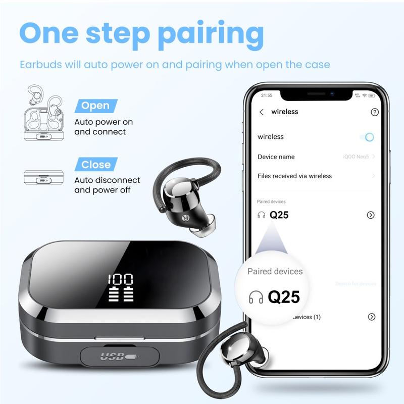 The Q25 is an excellent choice for users who want practical everyday earbuds with a more secure fit and extra functionality. Instead of offering only basic wireless playback, it adds useful features such as a power bank charging case, LED battery display, and multiple sound modes, making it especially convenient for people with active routines or longer days away from a charger.