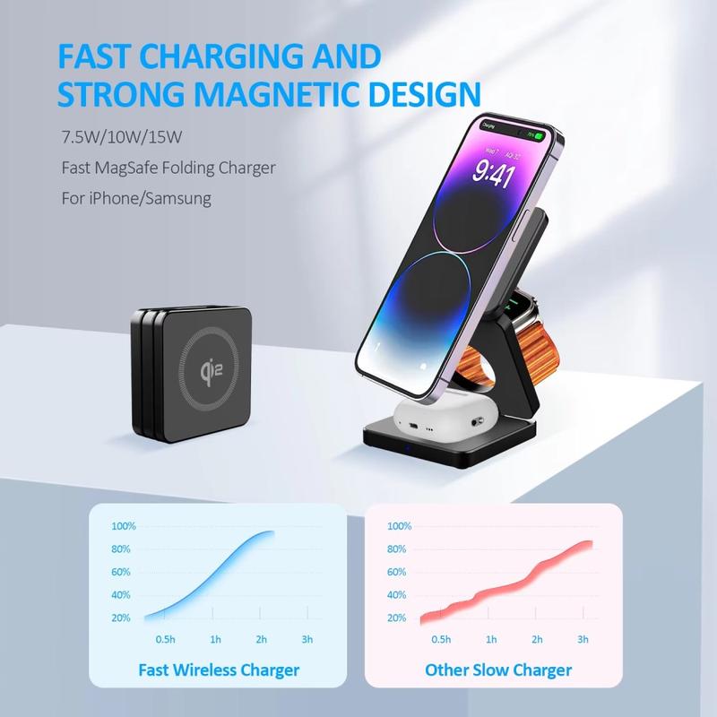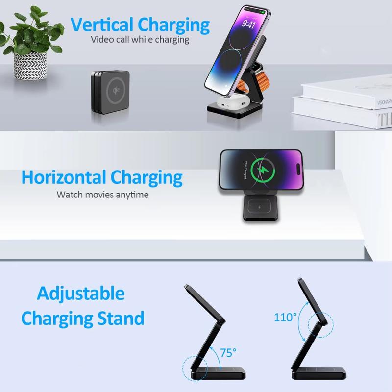 • Qi2 15W 3-in-1 Foldable Magnetic Wireless Charger Stand - for iPhone, Apple Watch & AirPods
