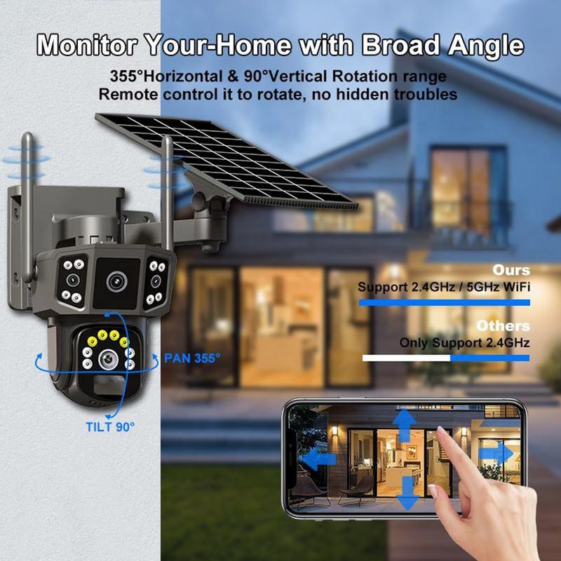 Secure outdoor areas with wide coverage and fewer blind spots using the QL18 dual-lens solar security camera. Designed for easy wireless setup on 2.4GHz WiFi, it combines two lenses with PTZ control so you can monitor key zones and remotely adjust the view when activity is detected. The 2K (2560x1440) resolution delivers sharper detail for entrances, yards, orchards, and work sites, while H.265 compression helps save storage space without sacrificing clarity.