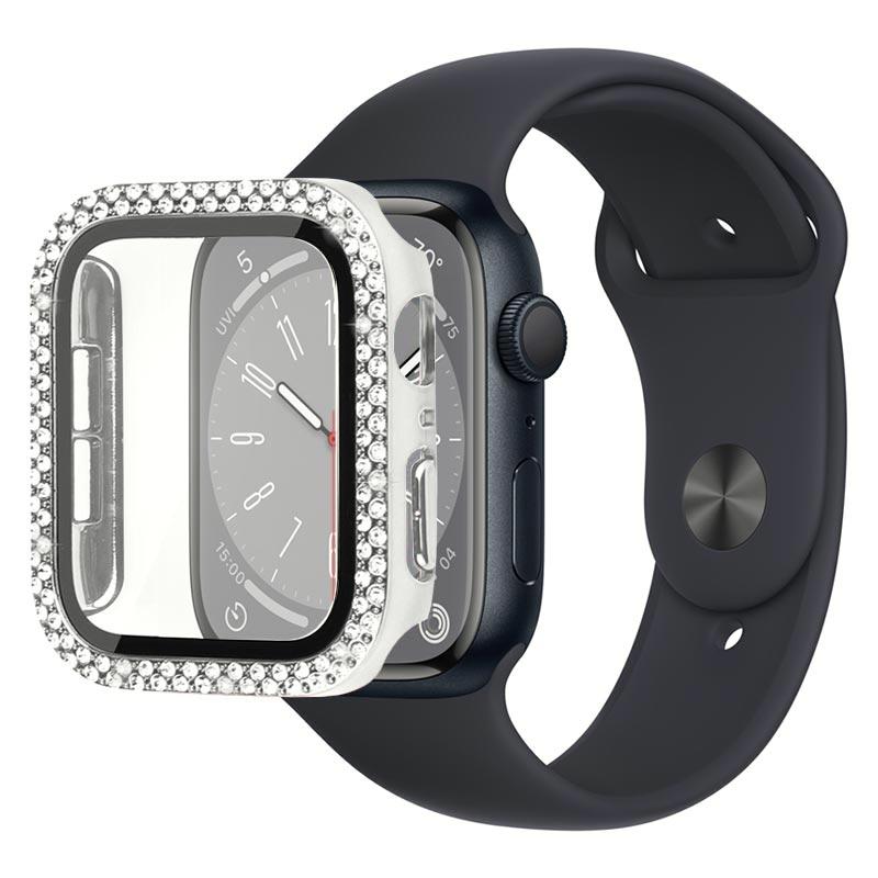 Glam up and protect your Apple Watch Series 9/8/7 with this attractive, shiny case with a screen protector. This super durable plastic case is boosted with the crystal-clear tempered glass screen protector to complete the protection of your Apple Watch Series 9/8/7. Meanwhile, sparkling and stylish rhinestones give your Apple Watch Series 9/8/7 a new stunning look that catches everyone's eye.
