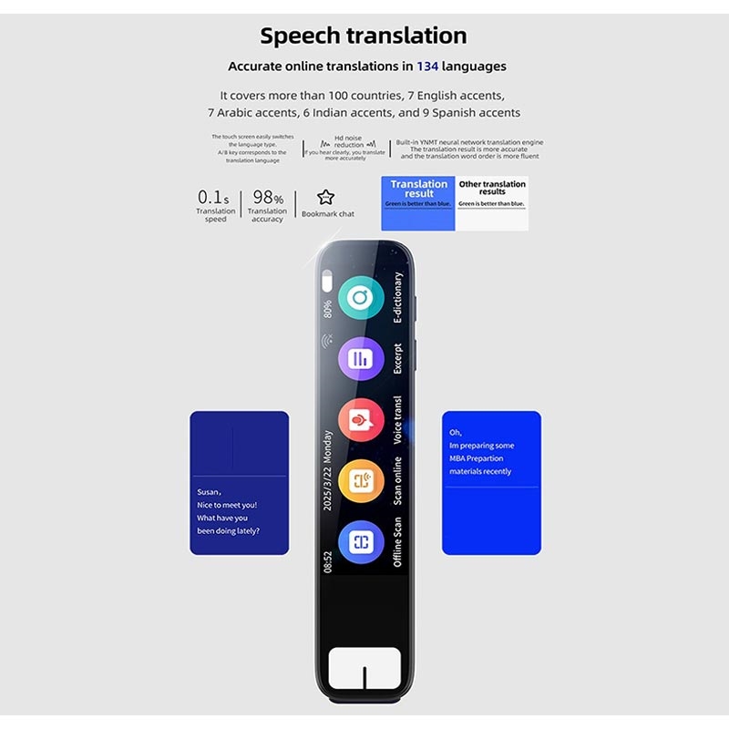 Photo translation uses optical character recognition (OCR) technology to scan and instantly translate text from images, making it especially useful for reading signs, menus, or documents while traveling. Voice translation in 134 languages also makes the S08B one of the most versatile handheld translators available.