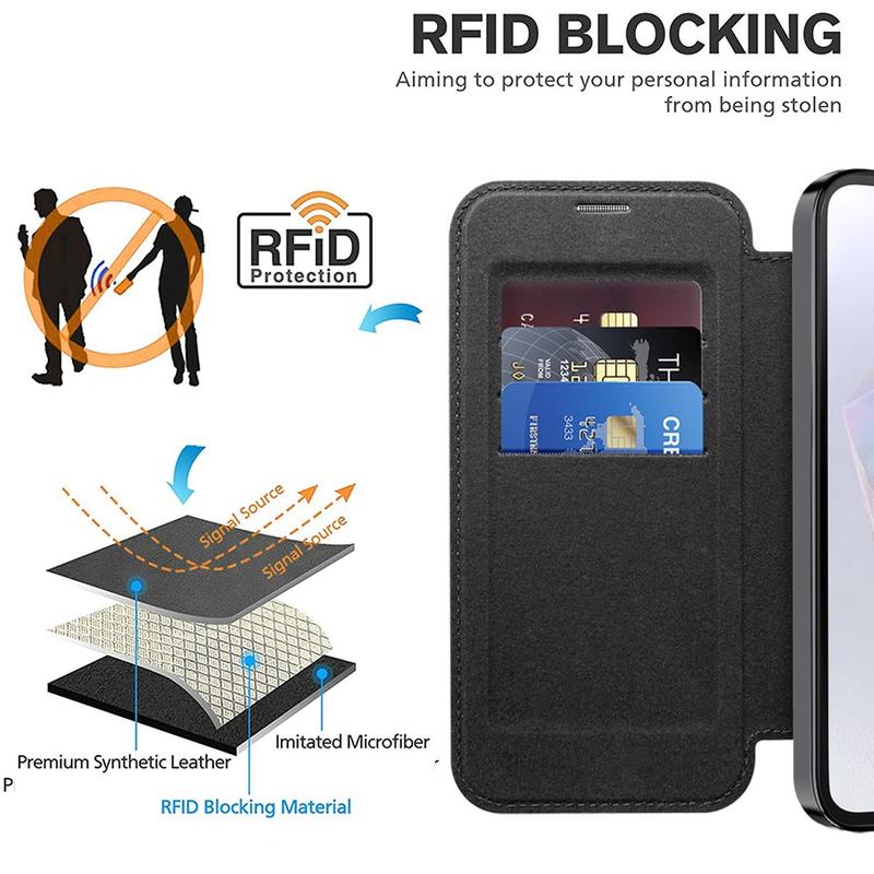- Features: Card slot, strong magnet for automatic closing, RFID blocking technology, built-in magnetic ring