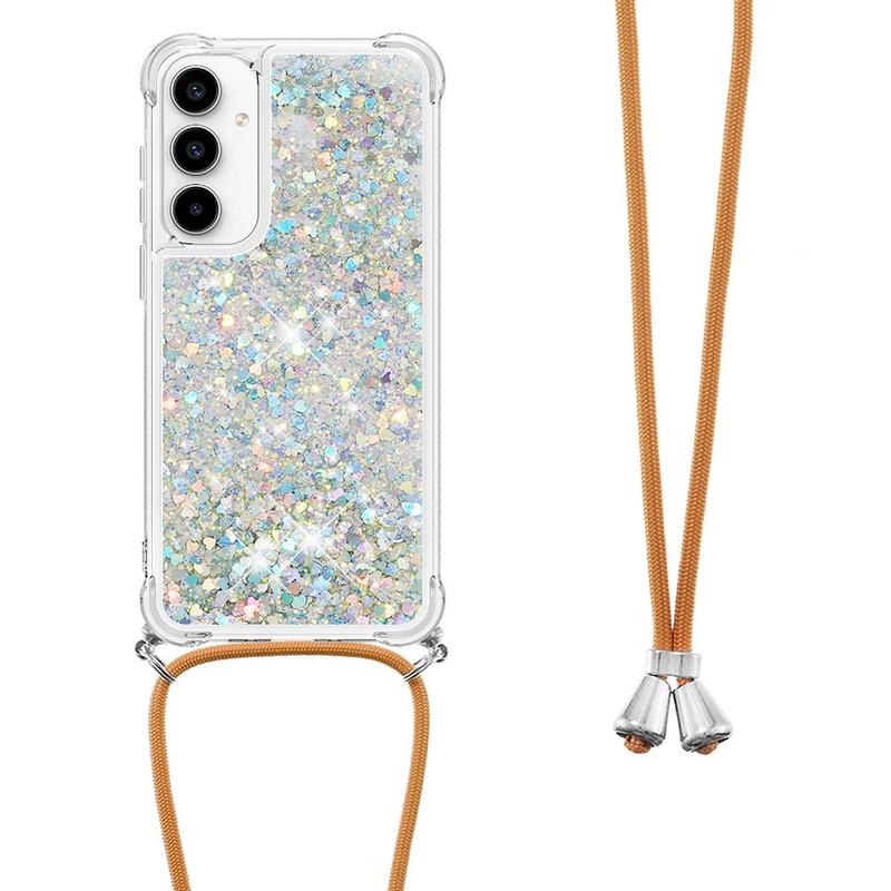 Transform your Samsung Galaxy A35 into a dazzling accessory with this sparkling protective case with a strap. This cover is made of highly durable TPU with reinforced corners that additionally safeguard your device. The case has exact cutouts for all ports and tactile side buttons so that you can use your Samsung Galaxy A35 as usual. At the same time, the long lanyard allows you to carry your Samsung Galaxy A35 safely and with more comfort.