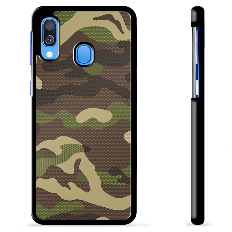 The Samsung Galaxy A40 Protective Cover in Camouflage design is a robust phone case tailored to safeguard the Samsung Galaxy A40 smartphone. This sturdy cover features a military-inspired camouflage pattern that provides a stylish aesthetic while offering a grip-enhancing surface, ensuring your device remains secure in your hand during use.