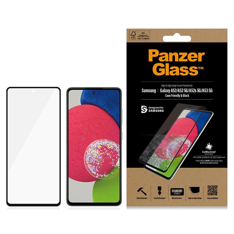PanzerGlass Case Friendly AntiBacterial Tempered Glass Screen Protector for Samsung Galaxy A52 5G, Galaxy A52 4G, Galaxy A52s 5G, Galaxy A53 5G
