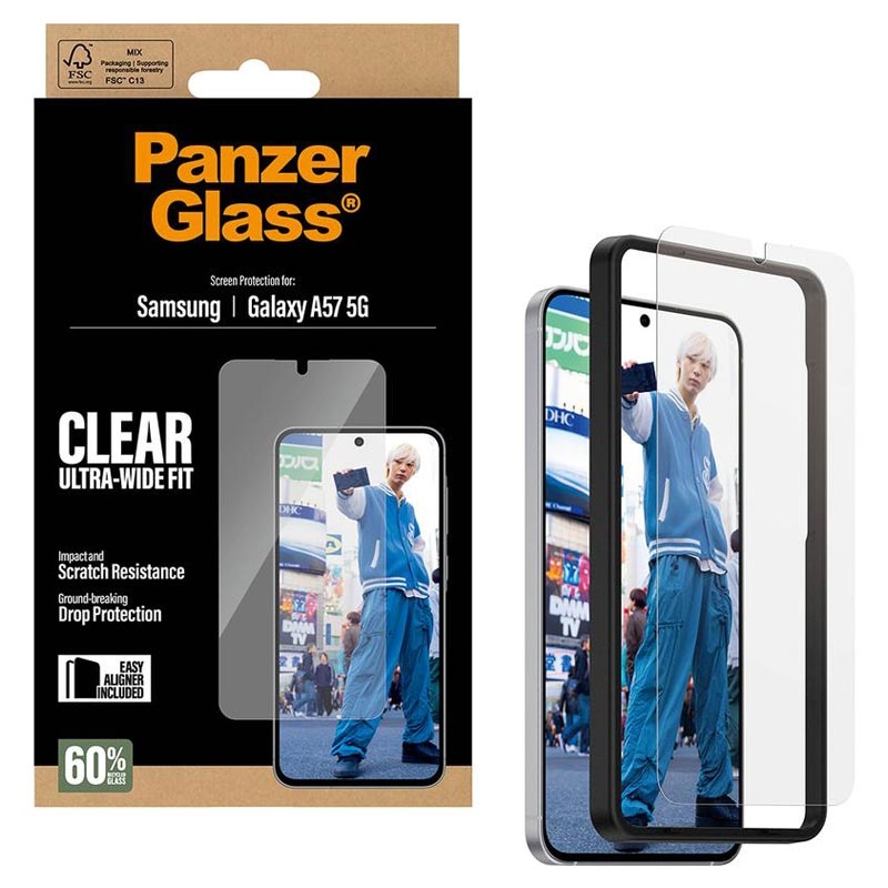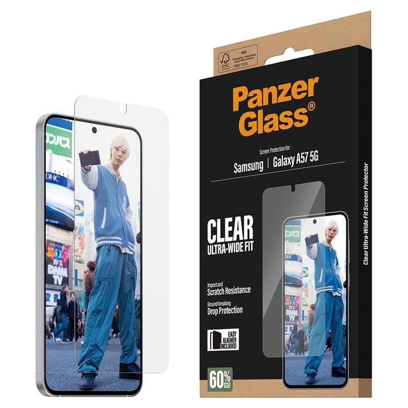 The PanzerGlass Ultra-Wide Fit screen protector with EasyAligner is the ultimate defense for your Samsung Galaxy A57 against everyday damage. Don't let accidental bumps or crushing falls ruin your device. With this scratch and shock-resistant screen protector, you can enjoy high-level drop protection and keep your phone looking pristine. Also, thanks to the included EasyAligner tool, the installation has never been easier.