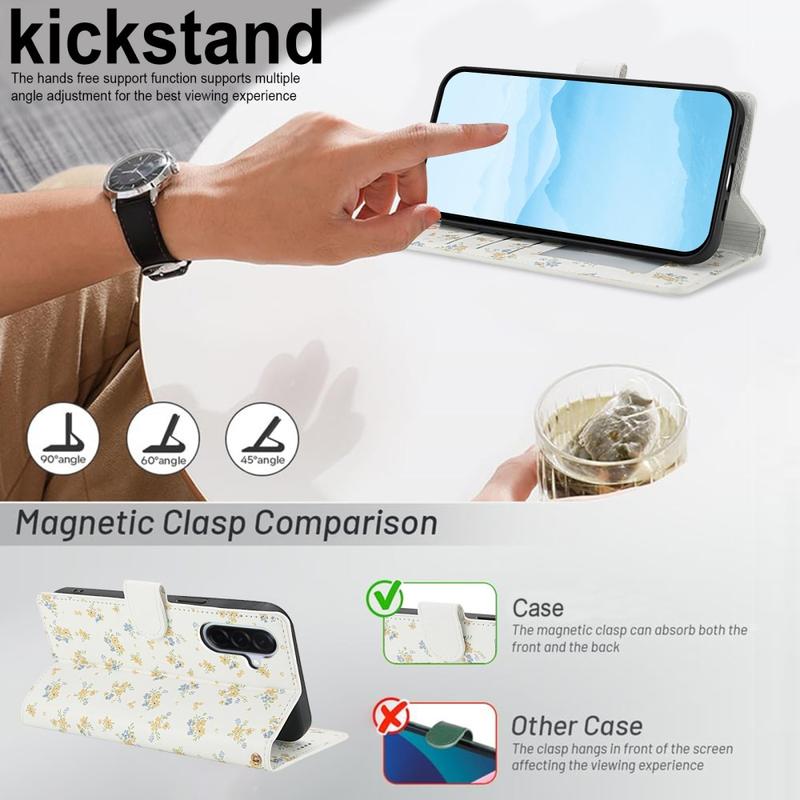 Refresh your Samsung Galaxy A57 with a slim flip wallet that blends secure protection and everyday practicality. The rhombic stitched front and tiny floral pattern add elegant style, while a soft TPU shell cushions drops and a polyurethane wrap guards against scratches. Multiple card slots, a cash pocket and an included wrist strap make this case the one-stop carry solution for commute, travel or night out.