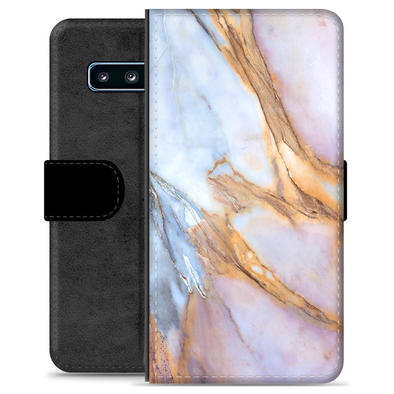 The Samsung Galaxy S10 Premium Wallet Case in Elegant Marble design is a sophisticated accessory that offers both style and functionality for your device. Crafted with attention to detail, the case features a luxurious marble pattern that exudes elegance and a timeless aesthetic, with creamy whites and opulent gold streaks that create an eye-catching look.