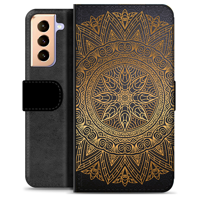The Samsung Galaxy S21+ 5G Premium Wallet Case with a Mandala design is an exquisite accessory designed to safeguard your smartphone in style. The case features a sophisticated mandala pattern embossed on the surface, creating an elegant and spiritual aesthetic that's sure to stand out.