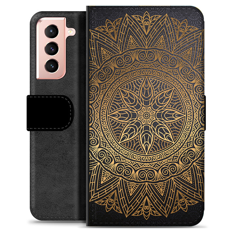 This exquisite Samsung Galaxy S21 5G Premium Wallet Case features a captivating mandala design, intricately detailed with golden accents that provide a touch of luxury and sophistication. The case is expertly crafted to accommodate the Galaxy S21 5G, ensuring a perfect fit and easy access to all buttons, ports, and the camera, without having to remove the phone from its protective cocoon.