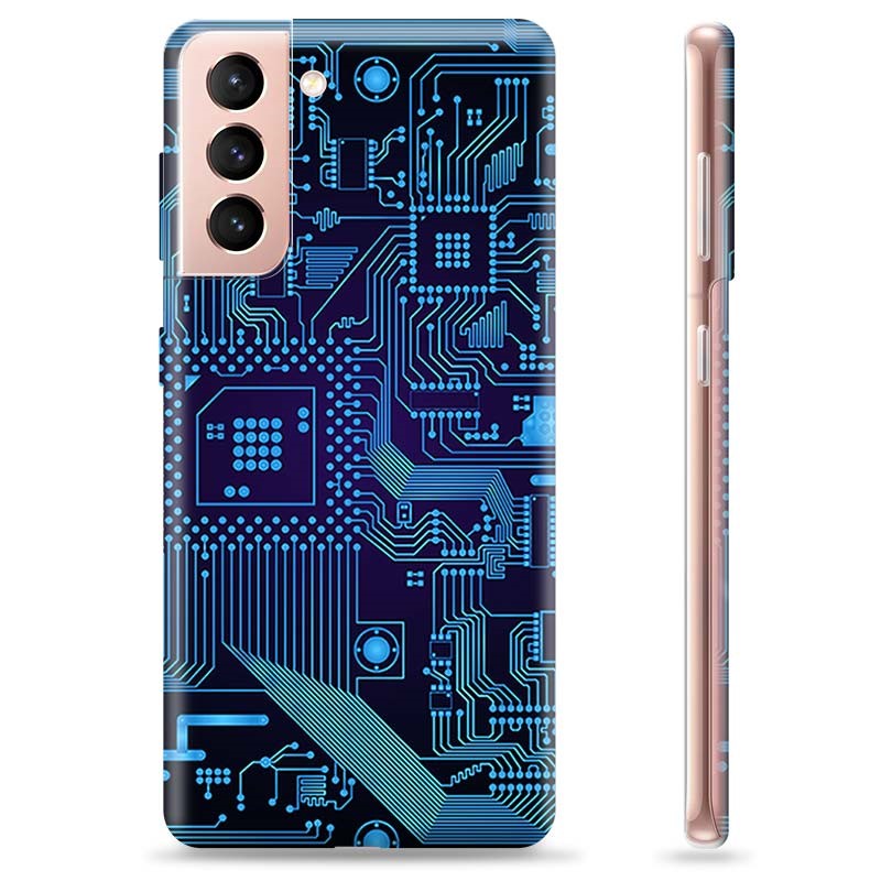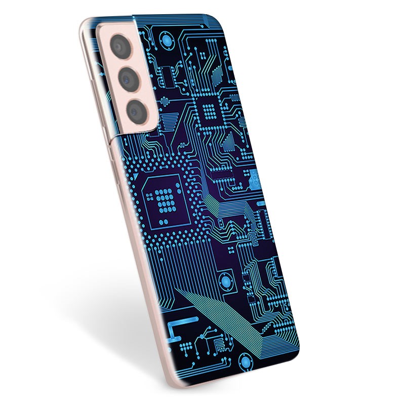 Crafted with precision, the case provides a snug fit, ensuring that your Galaxy S21 remains secure at all times. The vibrant circuit board graphic is printed with high-quality, fade-resistant ink, showcasing a blend of vivid blues and metallic accents that mimic the intricate pathways of an electronic board.
