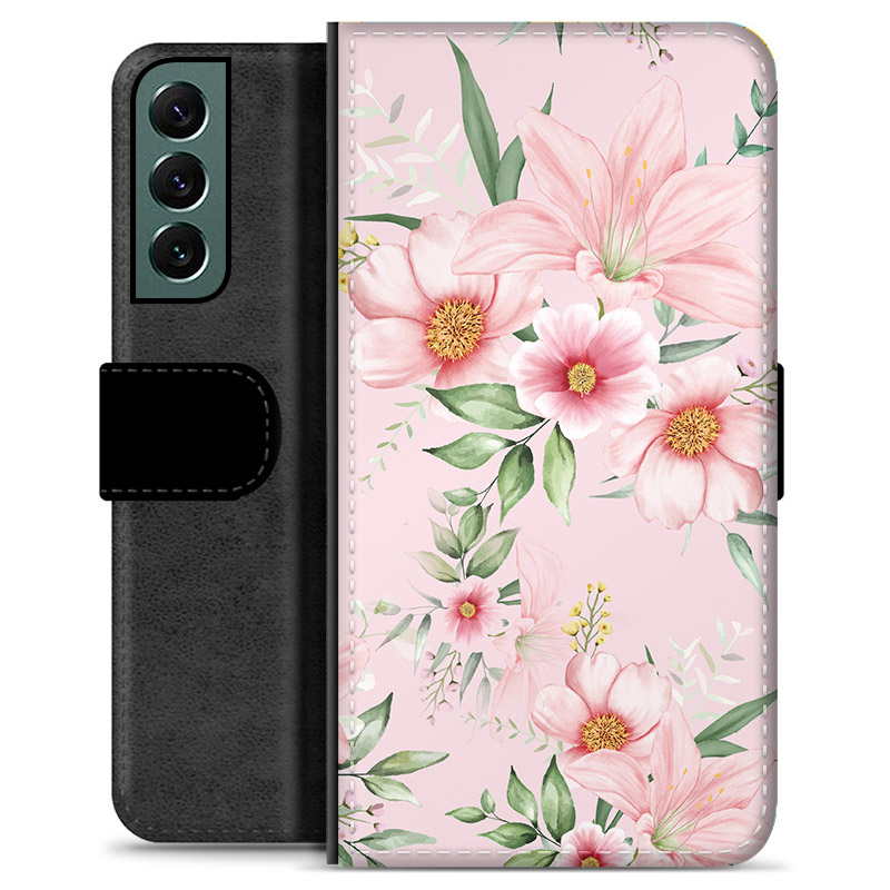 The Samsung Galaxy S22+ 5G Premium Wallet Case adorned with a Watercolor Flowers design combines both aesthetic appeal and practicality for smartphone protection. This elegantly crafted case features a symphony of delicate, pastel-hued floral elements, set against a soft pink background, offering a refreshing and artful take on phone case design.