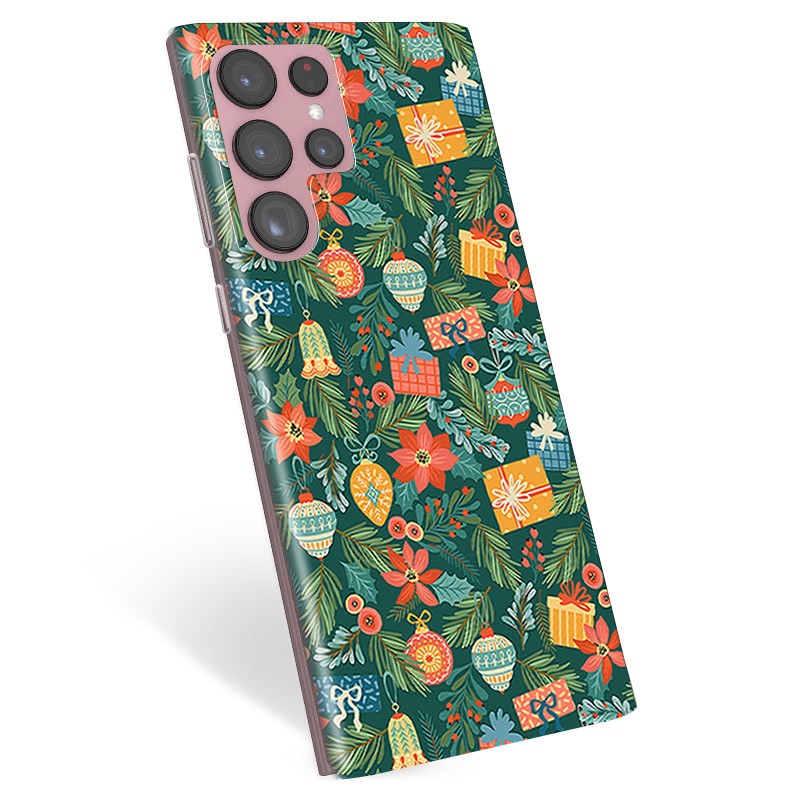Protect your Samsung Galaxy S22 Ultra 5G in festive style with the Christmas Decoration TPU Case. This case features a durable TPU construction that offers a blend of flexibility and strength to safeguard your device from daily wear and tear. The vibrant holiday-themed pattern showcases a colorful assortment of Christmas ornaments, presents, and foliage set against a deep green background, infusing your phone with the spirit of the season.