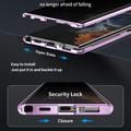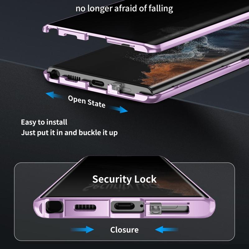 Two pieces design offers easy attachment and secure lock thanks to magnets and buckle. Built-in front tempered glass protects the display from scratches and impacts, side metal frame from bumps and drops, while matte composite material shields the back of the Samsung Galaxy S23 Ultra 5G.