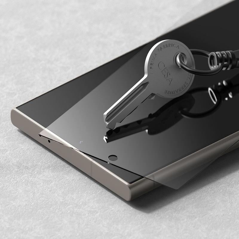 The Ringke Easy Slide tempered glass provides the perfect solution for protecting your Samsung Galaxy S24 Ultra screen. Made of processed and reinforced tempered glass, it offers a high degree of hardness (9H) that makes it resistant to scratches, even when in contact with sharp objects like knives or keys. The special oleophobic coating minimizes the appearance of fingerprints and other contaminants, keeping the glass surface clean and clear. Easy Slide is designed to protect the screen against scratches and impacts resulting from unexpected falls. The set includes an Easy Slide installation tool for easy and precise application. With the widest possible Case Friendly die cut, it is compatible with most cases on the market and with every Ringke case.