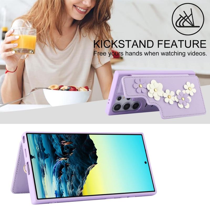 The Samsung Galaxy S24 Ultra Flower Decor Case is crafted from polyurethane and TPU materials, providing durable protection. The stylish design features flowers on the back of the case and hand strap. It includes a card slot for storing up to 4 essential cards, and the back card holder can also be used as a kickstand for multiple viewing angles. The magnetic button keeps the cards secure, while precise cutouts allow full access to all buttons and ports. Protect your phone from daily damage with this convenient case that comes with a hand strap and shoulder strap for easy carrying.